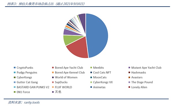 從具體應用而言,頭像類市場需求較為集中,頭部效應愈發凸顯。根據rarity數據進行預估測算,以7天平均成交ETH價格預估市值,CrytoPunks以近50%的市場份額保持著絕對領先優勢,其次則是Bored Ape YC、Meebits,三者總共占據頭像市場份額的76%左右。Cool Cats、Hashmarks等腰部類頭像項目根據市場的不同份額持續震蕩,但總體表現較為穩定,同時,隨著頭像類市場的走熱,諸如CyberKongz VX、0N1 Force等新興項目也在不斷涌現。