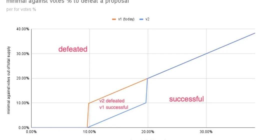 只要低于硬性投票人數,我們的提案就會被否決;一旦達到硬性投票人數(目前設置為10%),那么贊成票必須超過反對票,提案才能成功。在這部分的所有圖表中:線以上表示失敗,線以下表示成功。V1vsv2基線