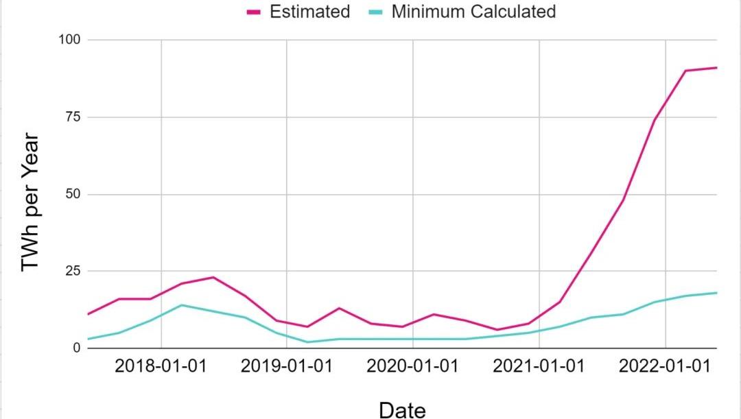 PoW和PoS各有利弊,前者對環境造成影響往往超過是否支持后者的爭論。隨著網絡用戶數量近年來的增長,這變成了一個更大的問題。好幾篇在業界備受尊崇的科學期刊中發表的文章討論了挖BTC對環境的影響,預測長期mining會對地球有著嚴峻的后果。然而,這些文章使用的研究方法似乎沒有一個是能得出準確結果的,所以PoW究竟有多少不好的影響仍然沒有確切答案。不過這并不改變PoW會導致全球變暖以及擁有大量碳排放的事實。幸運的是,當mining的環境影響變成廣泛學術界和媒體對于區塊鏈的主要批評點時,越來越多新老團隊已經開始向PoS倚靠了。以太坊基金會就是其中一個團隊,該團隊現在已經處于向PoS過渡的最后一個階段,并因此即將結束反對其區塊鏈的最主要的爭論。該團隊的過渡正好在一個極為關鍵的時刻發生,因為以太坊的PoW共識的能源消耗在過去兩年劇烈增加,如下圖所示。