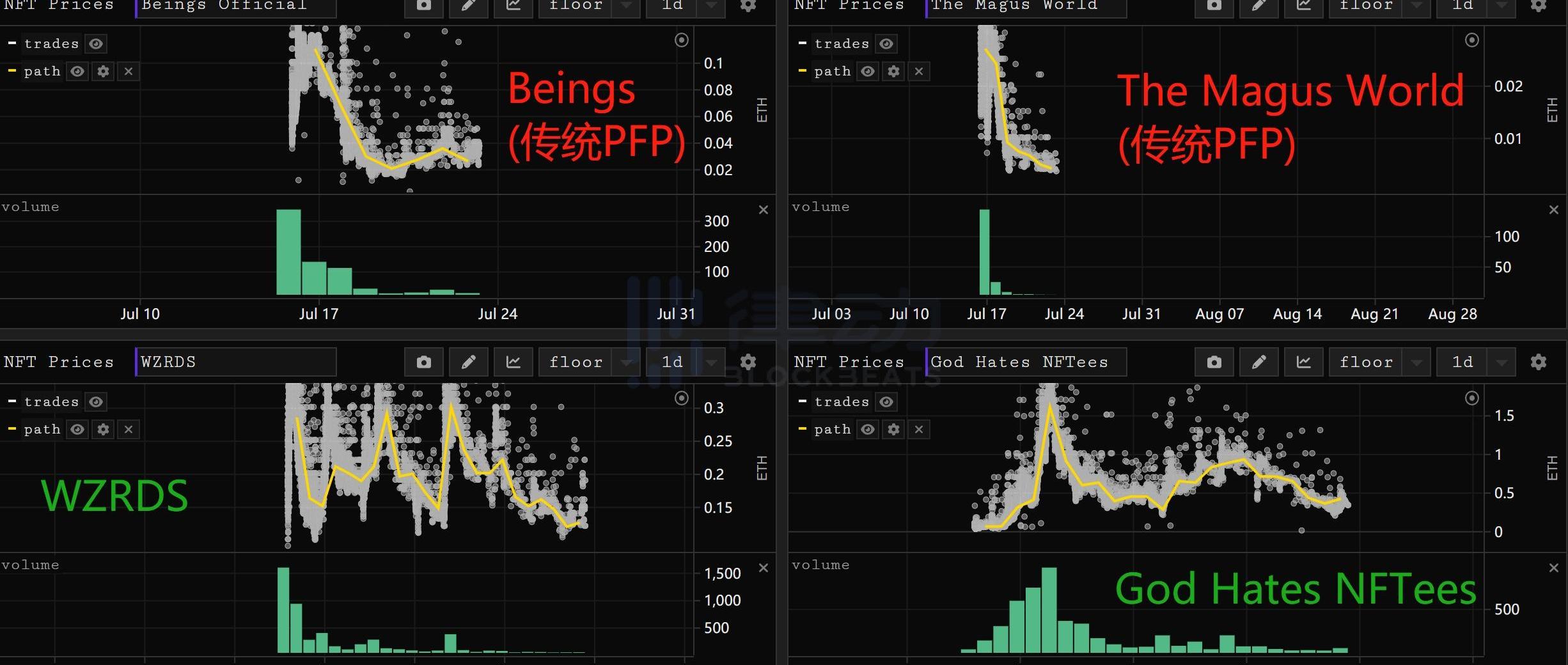 市場的不景氣令不少投資者進入了不活躍狀態,剩下的投資者也不再愿意花費Gas費以外的金錢以押注「長周期」的NFT項目——「販賣夢想?還是向我們展示你們能快速做到什么吧,否則我們連Gas費也不會掏」。「品牌養成」與「元宇宙基建」這兩張「大餅」,現在不好賣了。ThePossessed已是近期表現不俗的「品牌養成」類PFP項目。通過超發白名單,它們最終在0.25-0.35ETH的價格范圍內成功賣掉了全部10000個NFT。但其地板價最高只曾達到0.6ETH,并只穩定了大約一周的時間,就開始一路下滑至今。
