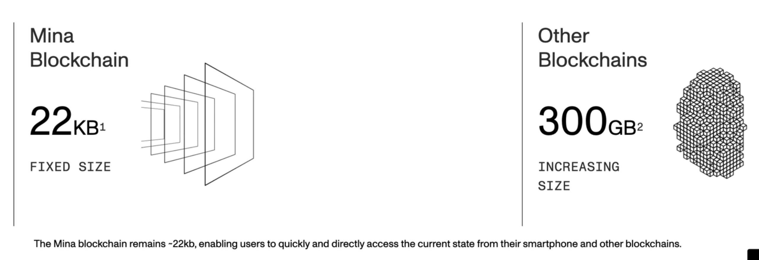 Mina的核心理念是「簡潔的區塊鏈」,整個Mina網絡中處理的所有交易所占區塊的大小都被限定在22KB。且最新的區塊中會包含整個區塊鏈的最新狀態,用戶只需一個zk-SNARK證明就可以在幾毫秒內完全驗證當前區塊鏈的狀態。