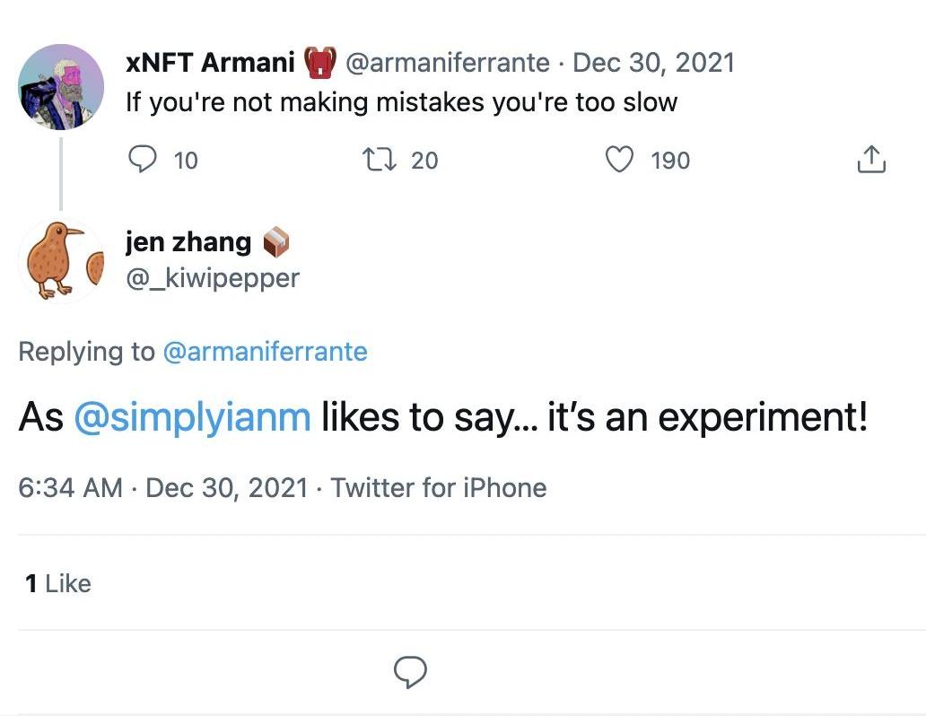 Ian、Dylan和傀儡匿名者不斷地在社交媒體上宣傳ShipCapital的工作。他們相互稱贊彼此的項目,并不斷鼓勵和宣傳建設者的功績。12月29日,Solana開發人員ArmaniFerrante發推文說:“如果你沒有犯錯,那你就太慢了,”五個Ian傀儡在四分鐘內做出了回應: