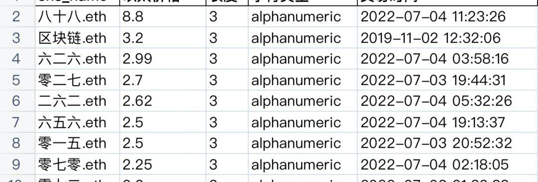 數據來源:ThePASS,高價ENS前20最近市場上出現了一些中文漢字的域名,同樣掀起了一波浪潮,市場表現不俗,我們列舉了成交價格排名前十的中文字符ENS,都是三位的,其中成交價格最高的是八十八.eth,以8.8ETH成交。
