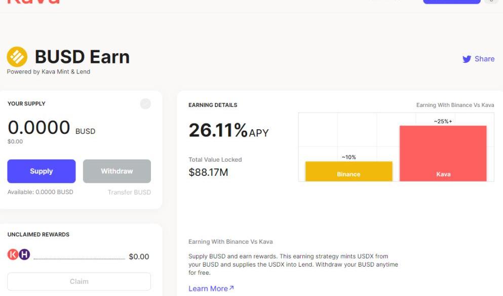 TronDeFi生態系統有兩種穩定幣:USDD和JUST。JUST先推出。它使用Maker的CDP模型,但只接受一個且唯一的TRX作為抵押品。對于Tron來說,支持USDD是有意義的,因為它不需要被過度抵押。與相同數量的TRX相比,Tron可以鑄造更多的USDD。Kava的USDX支持BUSD、BNB、BTCB、XRP抵押品和之前接受的UST。Terra崩盤后,USDX跌至0.65美元。BUSD的高收益是USDX目前的主要賣點。