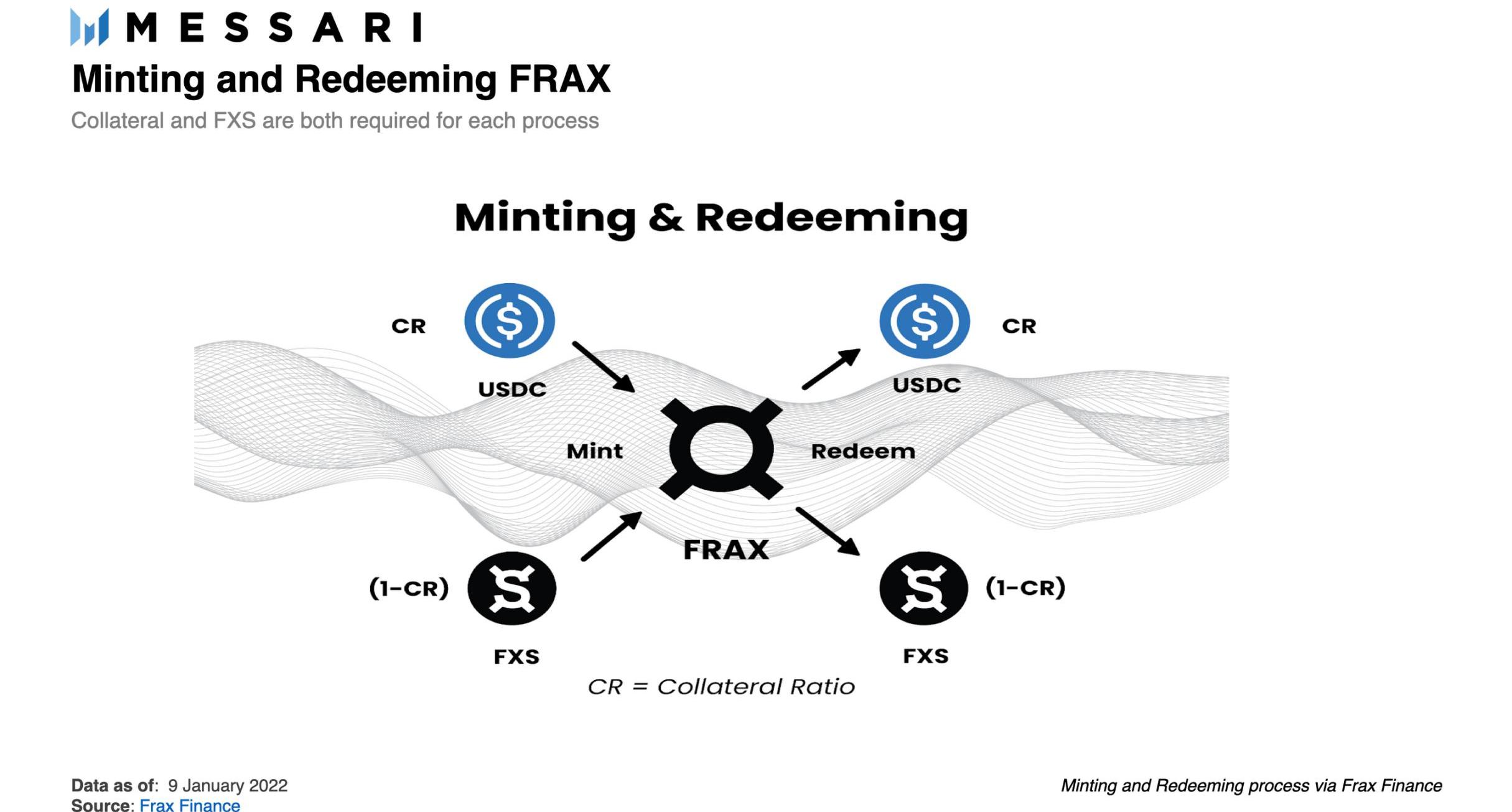 Frax是一種部分算法穩定幣:部分由抵押品支持,部分在算法上穩定。它開始時100%由USDC抵押,但隨著協議進入部分狀態,在鑄造期間進入系統的一些價值變成了FXS。在撰寫本文時,FRAX供應的9.5%是算法。