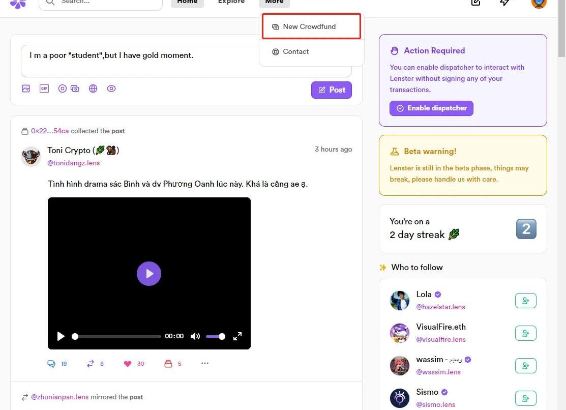 用戶可以在頁面上方找到眾籌按鈕,直接在Lenster上發起眾籌。
