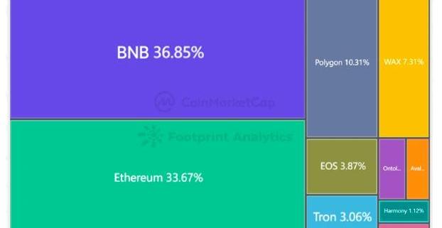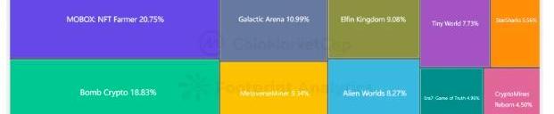圖14:五大頭部公鏈的用戶數量根據每個項目在公鏈上的市值占比,可以看出BNB鏈的生態系統相對健全和多樣——BNB鏈上的頂級游戲的交易量各自不超過總交易量的25%。與Ronin或Harmony相比,BNB鏈生態系統中的項目更加均衡。Ronin或Harmony中,頭部項目占據了總交易量的100%和99.8%。由于GameFi項目的波動性很大,即使是頂級游戲也可能會陷入死亡螺旋,因此多樣化的生態系統可以使公鏈在市場低迷時更具彈性。