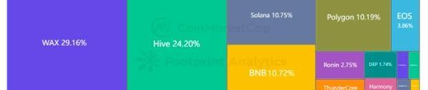 圖7:活躍用戶數趨勢在GameFi公鏈世界中,市場上還沒有出現一個占主導地位、成為項目方第一選擇的鏈。目前的階段去預測GameFi的行業領導者還為時過早。WAX和Hive是交易量排名前兩名的GameFi公鏈,極大程度上依賴于AlienWorlds和Splinterlands的成功,兩個游戲的用戶數量分別占其鏈上游戲玩家總數的54.55%和99.85%。值得一提的是,這兩條公鏈都不是為了單個游戲專門設立的。