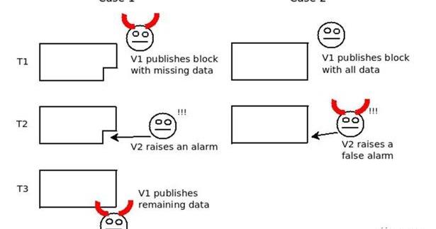 圖片來源:https://github.com/ethereum/research/wiki/A-note-on-data-availability-and-erasure-coding上圖中給出了兩種情況:其一,惡意的區塊生產者發布了數據缺失的區塊,這時誠實的全節點發出警告,但隨后該生產者又補充發布了剩余的數據;其二,誠實的區塊生產者發布了完整的區塊,但這時惡意的全節點發出了假警告。在這兩種情況下,網絡中的其他人在T3之后看到的區塊數據都是完整的,但都有人在其中作惡。這樣看來,采用欺詐證明來確保輕客戶端的數據可用性是存在漏洞的。解決方案