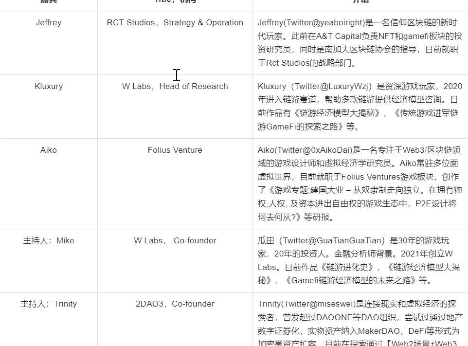 XRP/HKD-2.63%上周末和2DAO3一起組織了一次閉門會,人數控制在30人。邀請了RCT的Jeffrey、foliusventures的Aiko、Wlabs的Kluxury做主分享嘉賓,同時參加者有iosg,foresight,incuba,頭等艙,鏈捕手,footprint等鏈游研究機構的伙伴,有香港中文大學專門研究經濟體模型的教授,還有幾個頭部游戲廠商的web3團隊。全場都是干貨,直接討論痛點和創新模型,甚至具體到如”如何引導玩家在項目官網交易而不是去opensea”等問題,謝謝各位的參加!現在把一些會議節選和瓜友們共享。一,組織介紹