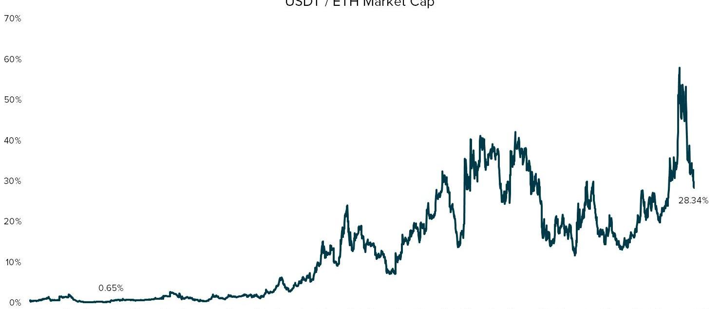 區分2016年的以太坊生態系統與用戶今天體驗和交互的以太坊協議、dApp和代幣的更發達的鏈上生態系統是很重要的。當前以太坊網絡的PoW分叉將帶來所有這些代幣的重復實例,這可能給開發人員和市場參與者帶來有意義的挑戰。事實上,由于試圖清算鏈上頭寸,DeFi的絕對復雜性和鎖定在DeFi協議中的資產支持代幣的數量對ETHW的價格構成了災難性風險。為了了解今天的賭注有多高,讓我們看一下以太坊生態系統的一個關鍵要素:穩定幣。2016年,當以太坊經典分叉時,穩定幣才剛剛開始受到關注。當年6月,Tether(USDT)的市值與以太坊(ETH)相比僅為0.65%,相比之下在撰寫本文時為28.34%。