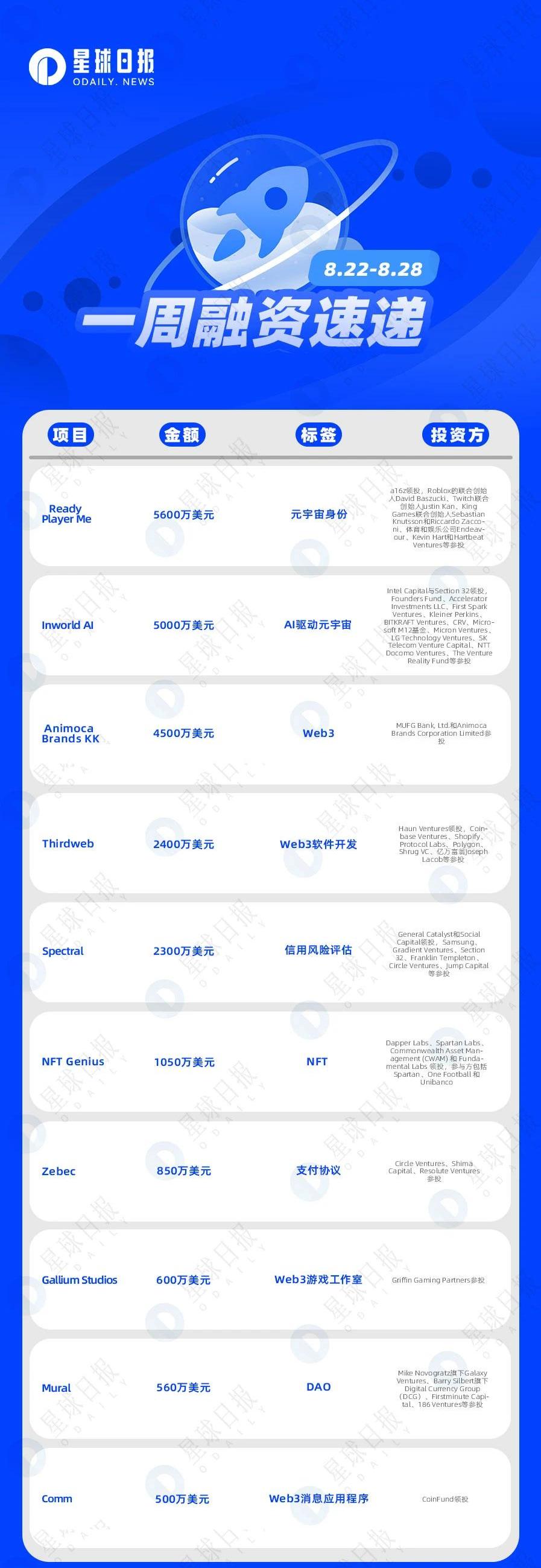元宇宙身份平臺ReadyPlayerMe完成5600萬美元B輪融資,a16z領投8月23日,元宇宙身份平臺ReadyPlayerMe完成5600萬美元融資,此輪融資由a16z領投,Roblox的聯合創始人DavidBaszucki、Twitch聯合創始人JustinKan、KingGames聯合創始人SebastianKnutsson和RiccardoZacconi、體育和娛樂公司Endeavour、KevinHart和HartbeatVentures等參投。ReadyPlayerMe旨在讓用戶得以在元宇宙中通過NFT等虛擬產品確立虛擬身份,目前已有1000多個項目方在該平臺使用其產品。媒體集團華納兄弟、時裝公司迪奧和運動服裝品牌新百倫都在與ReadyPlayerMe合作,以期在未來融入元宇宙。元宇宙平臺InworldAI完成5000萬美元融資,IntelCapital與Section32領投8月23日,AI驅動元宇宙平臺InworldAI宣布完成5000萬美元A輪融資,IntelCapital與Section32領投,FoundersFund、AcceleratorInvestmentsLLC、FirstSparkVentures、KleinerPerkins、BITKRAFTVentures、CRV、MicrosoftM12基金、MicronVentures、LGTechnologyVentures、SKTelecomVentureCapital、NTTDocomoVentures、TheVentureRealityFund等參投。據悉,Inworld使用AI技術構建元宇宙角色并賦予個性、思想、記憶和行為模仿人類互動的社會本質,其平臺已經和游戲引擎集成,開發人員可以輕松地將設計角色部署到游戲環境中。AnimocaBrandsJapan完成4500萬美元融資,MUFG等參投8月26日,據官方消息,AnimocaBrandsCorporationLimited戰略子公司AnimocaBrandsKK宣布以5億美元估值完成4500萬美元融資,MUFGBank,Ltd.和AnimocaBrandsCorporationLimited參投。AnimocaBrandsJapan將利用新資金繼續獲得熱門知識產權的許可,發展內部能力,并促進多個合作伙伴采用Web3,提高其品牌內容的價值和效用,同時促進日本NFT生態系統的發展。Web3軟件開發公司Thirdweb完成2400萬美元融資,HaunVentures領投8月25日,Web3軟件開發公司Thirdweb宣布以1.6億美元估值完成2400萬美元融資,HaunVentures領投,CoinbaseVentures、Shopify、ProtocolLabs、Polygon、ShrugVC、億萬富翁JosephLacob等參投。據悉,Thirdweb提供預構建的智能合約和SDK來幫助開發者創建各種產品,同時提供開發團隊用于跟蹤和管理鏈上合約的儀表板,目前支持以太坊、Avalanche和Fantom,計劃集成至Solana。本輪融資資金將用于擴展至Cosmos、NEAR、Flow等公鏈。Web3初創公司Spectral完成2300萬美元融資,GeneralCatalyst和SocialCapital領投8月24日,信用風險評估基礎設施Web3初創公司Spectral完成2300萬美元融資,GeneralCatalyst和SocialCapital領投,Samsung、GradientVentures、Section32、FranklinTempleton、CircleVentures、JumpCapital等參投。迄今為止,該公司已籌集了約3000萬美元。據悉,Spectral建立了一個相當于傳統FICO評分的鏈上評分,稱為多資產信用風險預言機評分,允許用戶通過其平臺檢查鏈上評分。融資將用于建立其信用評分網絡并逐步擴大規模。FlowNFT市場開發商NFTGenius以1.5億美元估值完成1050萬美元A輪融資,DapperLabs等領投8月26日,NFTGenius以1.5億美元估值完成1050萬美元A輪融資,DapperLabs、SpartanLabs、CommonwealthAssetManagement(CWAM)和FundamentalLabs領投,參與方包括Spartan、OneFootball和Unibanco。NFTGenius是一家提供NFT項目和市場技術的公司,正在開發基于Flow的NFT二級市場Gaia,該項目由DapperWallet提供支持,接受信用卡付款,以使非加密本地人更容易購買NFT。NFTGenius將利用新資金將其足跡擴展到體育以外,并支持主要的娛樂和文化交易,以擴大Gaia市場,以接觸主流消費者。Solana流支付協議Zebec完成850萬美元融資,CircleVentures等參投8月27日,Solana生態流支付協議Zebec以10億美元完全稀釋估值完成850萬美元融資,CircleVentures、ShimaCapital、ResoluteVentures參投。預計到2022年底,Zebec的收入將達到2000萬美元,凈利潤為600萬美元。今年早些時候,Zebec與Visa合作,加入其FintechFastTrackProgram。Zebec很快將推出定制借記卡。此外,到2024年,Zebec用戶數量預計將達到200萬個。Zebec還計劃在收入達到1萬億美元后推出穩定幣。Web3游戲工作室GalliumStudios完成600萬美元融資,GriffinGamingPartners參投8月22日,Web3游戲工作室GalliumStudios宣布完成600萬美元融資,GriffinGamingPartners參投。據悉,GalliumStudios由傳奇視頻游戲設計師、《模擬人生》系列開發者WillWright和《卡門·山迪亞哥在哪里?》開發者LaurenElliott成立,旨在制作無縫融合最新Web3和AI技術、面向創作者的模擬游戲。Gallium參與的項目包括為GalaGames設計的元宇宙VoxVerse和記憶模擬游戲Proxi,兩者都使用區塊鏈技術。GalliumStudios已與區塊鏈技術公司Forte.io達成合作,以增強玩家在游戲經濟中的所有權,并為玩家提供對區塊鏈和Web3技術的無縫訪問,比如嵌入式代幣錢包和NFT市場。DAO基礎設施提供商Mural完成560萬美元融資,DCG等參投8月23日,專注于去中心化自治組織基礎設施的加密公司Mural宣布完成560萬美元種子輪融資,MikeNovogratz旗下GalaxyVentures、BarrySilbert旗下DigitalCurrencyGroup、FirstminuteCapital、186Ventures等參投,這是該公司進行的首次外部融資。Mural聯合創始人KevinAlvarez-Fung稱,這筆資金將用于引進新人才,并與全球希望創建和使用DAO的品牌合作。Web3初創公司Comm完成500萬美元的種子輪融資,CoinFund領投8月25日,Web3消息應用程序Comm籌集了500萬美元的種子輪融資,由CoinFund領投。目前Comm有4名全職員工,約有12名兼職人員參與該項目。CommCEO計劃在加薪后繼續擴大他在紐約的團隊,讓少數員工遠程工作。Comm旨在讓社區成員托管自己的后端服務器,只有用戶自己才能訪問他們的數據,這家消費者隱私初創公司正在致力于擴展適用于Signal或Whatsapp等聊天應用程序的端到端(E2E)加密通訊服