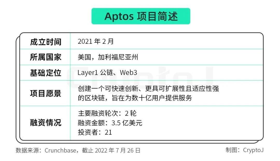 XRP/HKD-1.15%公鏈項目Aptos自今年2月正式曝光以來,因自帶Facebook團隊出身背景而一直持續受到市場關注,「明星團隊出身光環」的加持下,資本方拋出了高昂的橄欖枝,7月25日,Aptos完成1.5億美元新一輪融資,截至目前,已公開總融資額達到了3.5億美元,在沉寂的市場下,Aptos攜手Sui、Linera等項目掀起一輪「Meta系Layer1」討論浪潮。Aptos在主網還未上線的情況下已獲取數億級別的融資進展以及足夠的市場關注度,但在與以BSC、Solana、Avalanche、Fantom、Near等為代表的已發展相對較為成熟的Layer1公鏈相比,仍處于早期發展階段。CryptoJ將根據公開資料從Aptos項目基本情況、生態發展、技術網絡進展、發展規劃等多方面展開簡單討論,本文研究內容僅供參考,不構成投資建議。本文亮點總結,TL;DR:第一部分:從Aptos基本定位、發展至今重要事件、時間節點樹立、主要團隊背景、公開融資情況等多方面介紹Aptos的基本情況;第二部分:以DeFi、NFT、錢包、基礎設施、Web3等多個模塊為入口梳理Aptos現有生態項目以及其主要社交媒體熱度;第三部分:從Move語言、狀態同步、激勵測試網、并行執行引擎、BFT共識協議、技術路線圖的區塊鏈核心堆棧等方面探索Aptos現有網絡與技術進展;第四部分:從主網實際落地、公鏈賽道的競爭、Meta系同類競爭網絡、網絡價值捕獲和學習成本等五個方面探討Aptos未來發展的潛在不確定性因素。一、Aptos基本情況