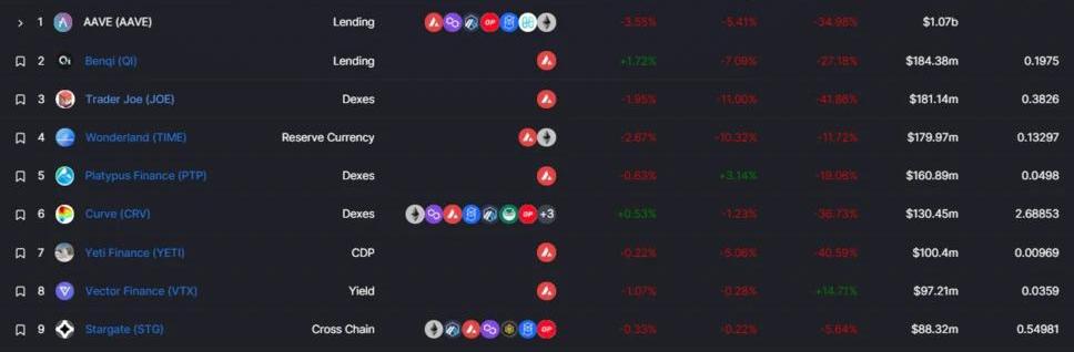 Aave在所有生態項目的TVL中占比接近一半,占比高,很大程度是因為跌幅最少,距離高點跌幅僅30%,其余項目距離高點的跌幅在70%-90%。但是需要注意的是AaveV3有90%份額在Avalanche上,當然與代幣激勵有一定的關系,不過也能從側面看出Avax生態發展不錯。