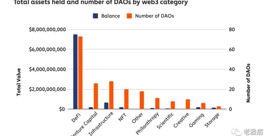如今,幾乎所有事物都有一個DAO。它們的有效性和相關性仍然受到質疑,但越來越清楚的是,與DeFi相關的DAO將在可預見的未來占據主導地位。與DeFi相關的企業在DAO中持有約83%的資本。與DeFi相關的DAO平均管理著約1億美元的資金。這是有原因的。DeFi相關企業的現金流和典型的op-ex完全在鏈上。當DAO與鏈下世界交互的時候,就很難驗證發生了什么。