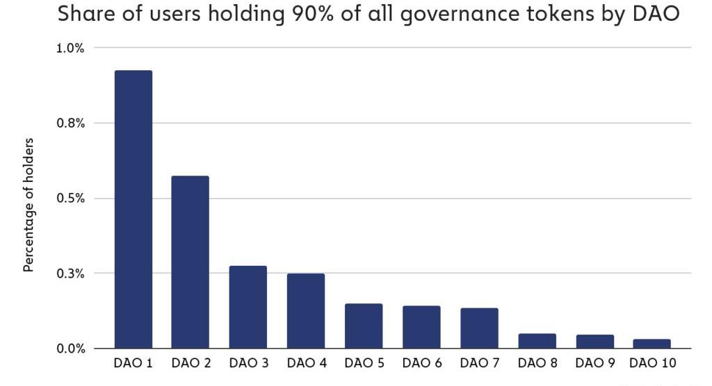 通過分析十個DAO治理代幣的分布,我們發現在幾個主要DAO中,不到1%的持有者擁有90%的投票權。