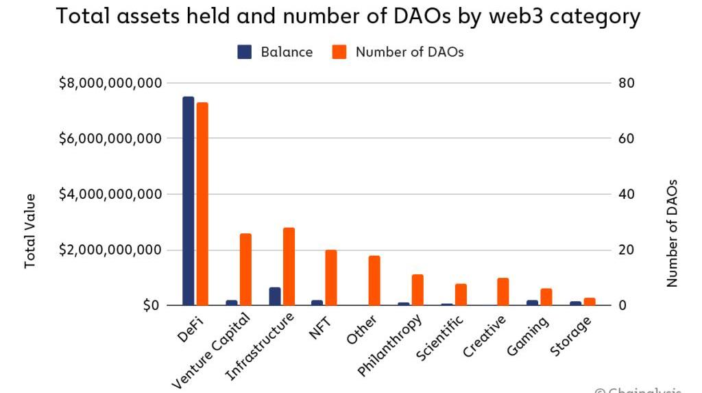 各種DAO的資產占比和數量占比專注于風險投資、基礎設施和NFT的DAO也有較大占比,這表明DAO對投資者、開發人員和藝術家都具有吸引力。但是他們的鏈上資產價值相對較小。不同種類的DAO界限是模糊的。游戲DAO通常與NFT有關,風險投資基金DAO通常為DeFi提供資金,而基礎設施DAO支持上述所有類別。資金管理:DAO持有哪些資產?