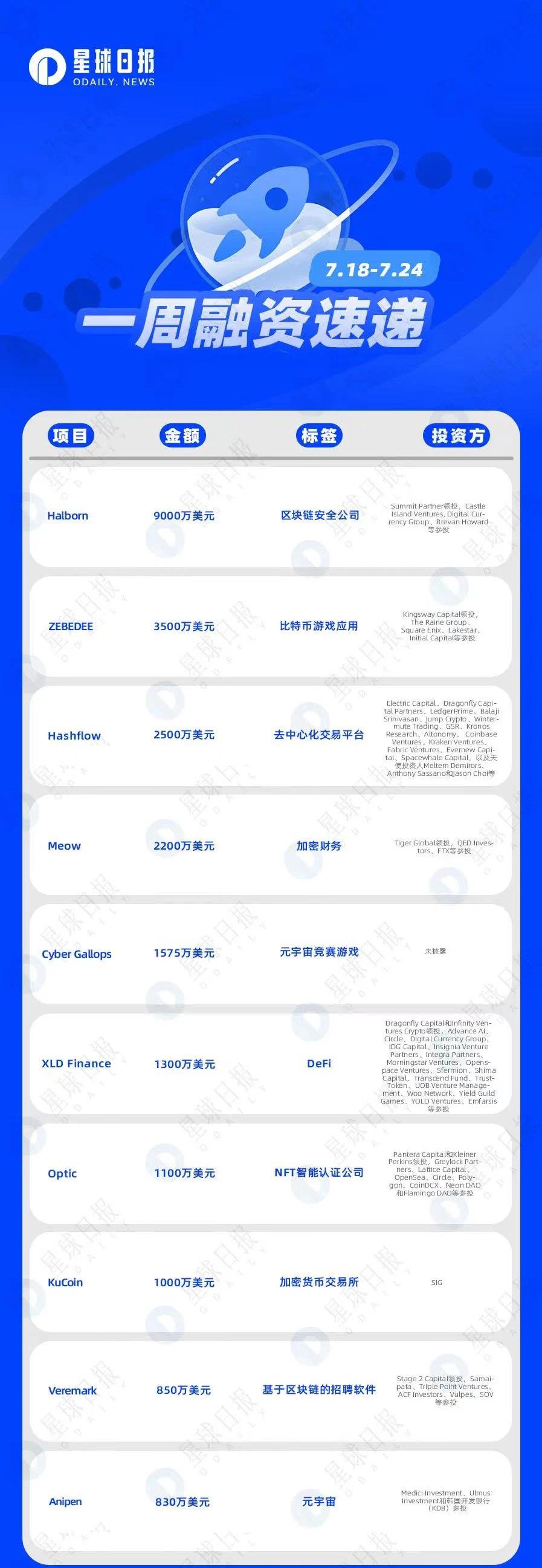 XRP/HKD-4.12%經Odaily星球日報不完全統計,7月18日-7月24日當周公布的海內外區塊鏈融資事件共27起,較前一周有一定減少;已披露融資總額約為2.7億美元,較前一周有大幅下降,下降幅度約50%。上周比較值得關注的獲投項目有區塊鏈安全公司Halborn和比特幣游戲應用ZEBEDEE。以下為具體融資事件: