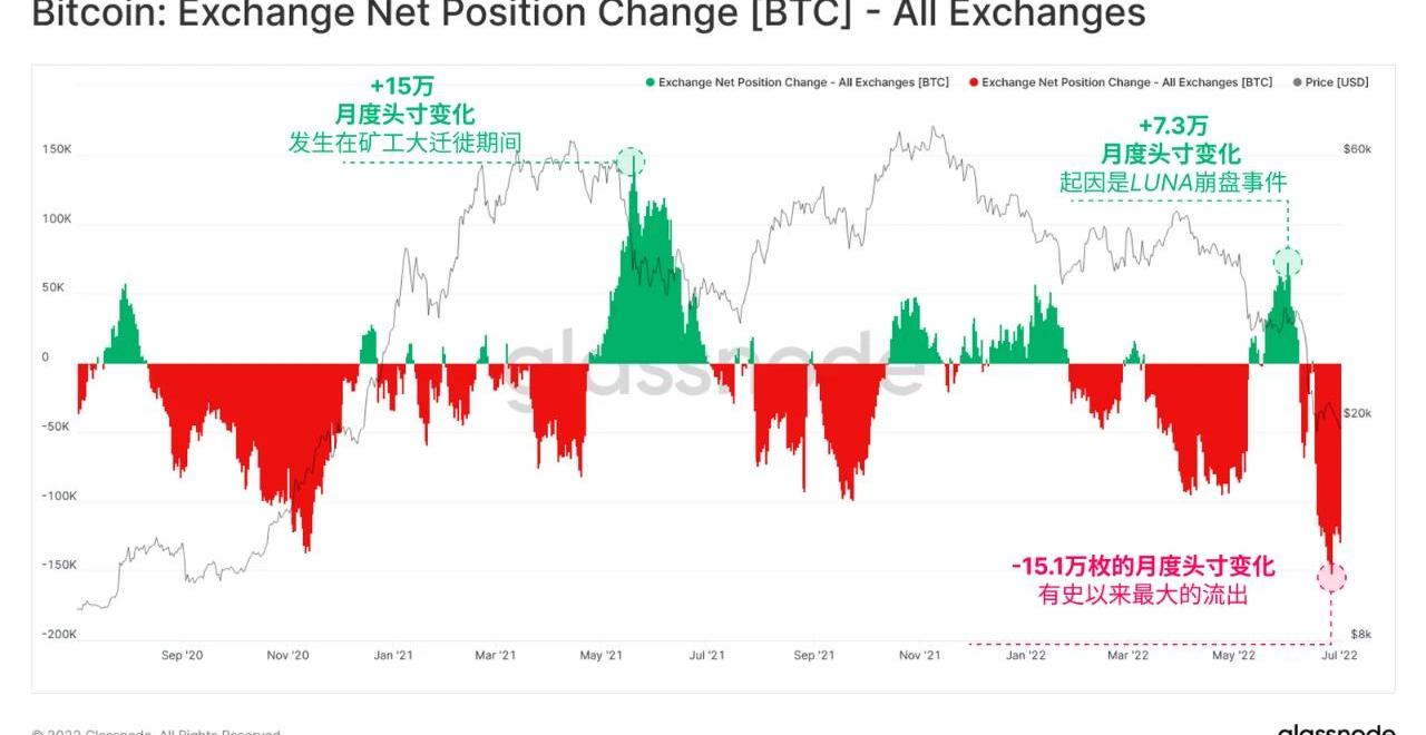 我們可以以單個交易所為對象來觀察這些儲備的變化,我們發現一個有趣的分歧:Coinbase繼續出現比特幣凈流出,過去兩年累計減少45萬枚比特幣。Coinbase的比特幣余額以1萬到3萬枚的步驟持續下降。這些比特幣正被轉移到與Coinbase實體無關的新錢包。鑒于其持有量,這些可能是機構的托管方案。另一方面,在同一時間內,幣安的凈余額大約增加了30萬枚比特幣。因此,正如本周TXMC所強調的那樣,幣安現在已經取代Coinbase成為擁有比特幣最多供應量的交易所。伴隨著歷史上糟糕的比特幣價格表現,交易所余額出現了有史以來最大的月度下降,達到了15萬枚比特幣/月的流出率。整個6月份的流出量占了交易所余額減少總量的5.0%至6.0%。這與2021年5月至6月發生的比特幣涌入交易所的情況形成了鮮明的對比。