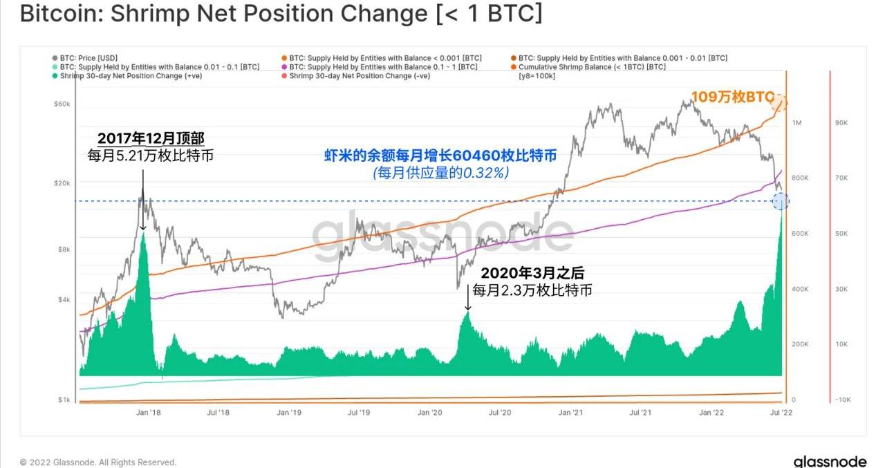 深入研究,我們可以看到,蝦米們正在以每月60460枚比特幣的速度增加他們的余額,創造了歷史上最積極進取的速度。這相當于每月流通供應量的0.32%。有趣的是,蝦類余額擴張的速度超過了2017年12月歷史前高時創下的記錄,當時的價格也在2萬美元。蝦米群體顯然認為2萬美元是一個有吸引力的價格,盡管這一次價格呈現向下趨勢。