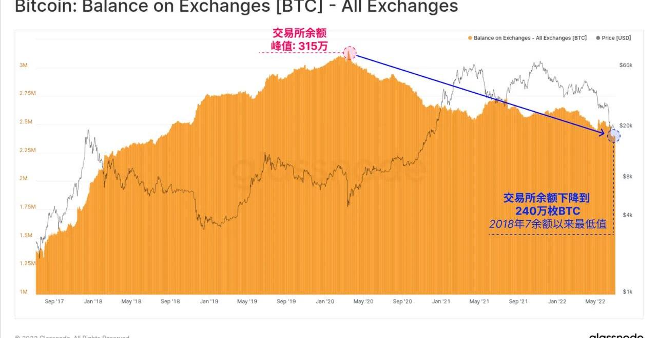 交易所儲備繼續出現大規模的凈流出,總余額下降到2018年7月的水平。自2020年3月以來,交易所的總余額已經出現了75萬枚比特幣的累計流出。僅僅在過去的三個月里,就有大約142.5萬枚比特幣流出,占總數的18.8%。這種規模的資金外流,尤其是在價格極端下行的情況下,是耐人尋味的,我們將在接下來的章節中進一步分解這些資金的流出情況。