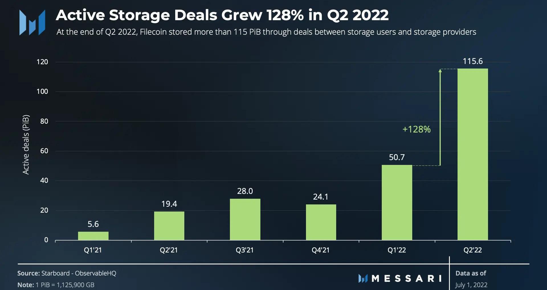 到2022年第二季度末,Filecoin通過活躍交易存儲了超過115PB數據,相較上一季度增長了128%。這可能歸因于向用戶收取的存儲數據的低至幾乎零費用。存儲交易細節
