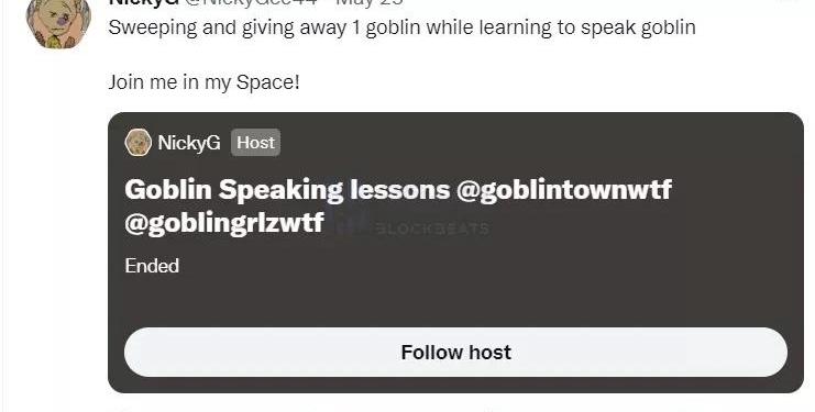 相信大部分人看到新晉的「榜一大哥」goblintown的第一反應想到的是來自電影《指環王》中土世界的咕嚕,腦海中回蕩的是它不停在嘴里念叨著的「myprecious」古怪聲音。試想一下,用咕嚕的發音不停的在重復「wenroadmap?」、「wentoken?」、「airdrop!」這些詞匯會是怎樣的效果。沒錯,在剛剛結束不久的goblintownNFT的twitterspace上,所有頂著goblintownNFT的持有人就是用這樣的「魔性」的方式,又一次洗腦了NFT的玩家們,twitterspace的錄屏瘋狂的在各大社交媒體和社區之間傳播。這個長達3小時的twitterspace,播放超過4.5萬次。就連NeoTokyo的創始人EllioTrades都發推說:「xxx,我也想發出goblin的聲音」