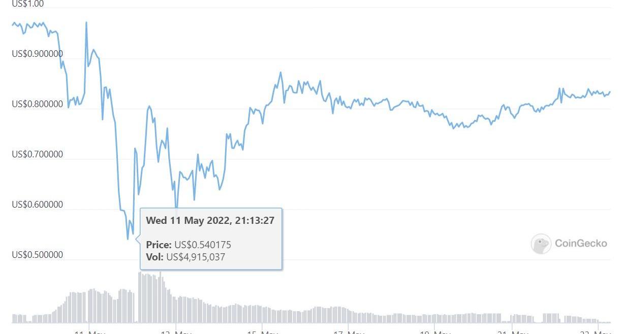 5月13日,KavaNetwork的原生去中心化穩定幣USDX脫錨,價格一度最低暴跌至0.55美元,主要原因便是USDX的部分抵押品為UST,且同樣作為Cosmos生態的區塊鏈網絡,Kava中UST等Terra資產抵押應用也存在風險。隨即5月14日,Kava決定從協議中刪除所有Terra風險資產,所有UST也從Kava移除。但截至發文時,據CoinGecko數據顯示,USDX約0.83美元,仍未完全恢復錨定。