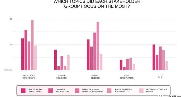 至于利益相關者對不同治理維度的觀點,我們發現協議外交官和小股東最關心與規則、障礙可及性相關的問題,而角色和組織結構是有實力的投資者和LP的主要關注點。有趣的是,參與的財務和非財務動機對我們采訪的所有類別的利益相關者都具有重要意義。也許協議外交官很少談及這個問題,因為他們的動機從一開始就更加明確。