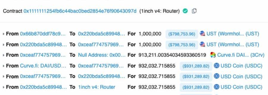 根據鏈上數據,我們發現這些錢包在Terra上時主要與Anchor協議互動。在從Terra橋接到Ethereum后,他們與Curve和1inch進行了互動。下面,我們將介紹一些在UST脫錨前不久在Wormhole橋上記錄了大量交易的可疑錢包。1.0x8d47f08ebc5554504742f547eb721a43d4947d0a(A)(SeeFigure7)