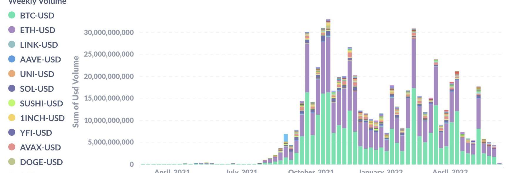 以dYdX在L2上交易量較大的BTC/USD交易對為例,據官方統計,2022年5月29日~6月4日期間,一周時間的總交易量為17.7億美元。而高點時,2022年2月13日-2月19日期間,BTC/USD的交易量為172.7億美元,目前已下降89.8%。小結
