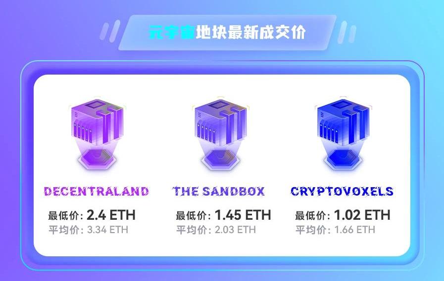 元宇宙平臺中,過去24小時內,Decentraland上的地塊最低成交價為2.4ETH、平均成交價為3.34ETH;TheSandbox上的地塊最低成交價為1.45ETH、平均成交價為2.03ETH;Cryptovoxels上的地塊最低成交價為1.02ETH、平均成交價為1.66ETH。