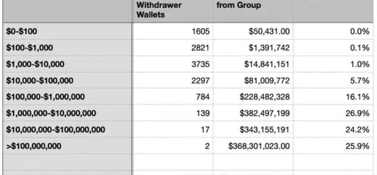 我們能得出一個結論,大規模的恐慌并沒有蔓延,人們依然想把他們UST存在Anchor中。大部分用戶在這次脫錨事件中并沒有移動他們的資金,甚至都毫無察覺此次事件。小部分人產生了恐慌,并造成了價值100萬美元以下的資金移動。而75%的資金轉移量來自于恐慌人群的1%,他們占所有用戶的0.1%。原地址