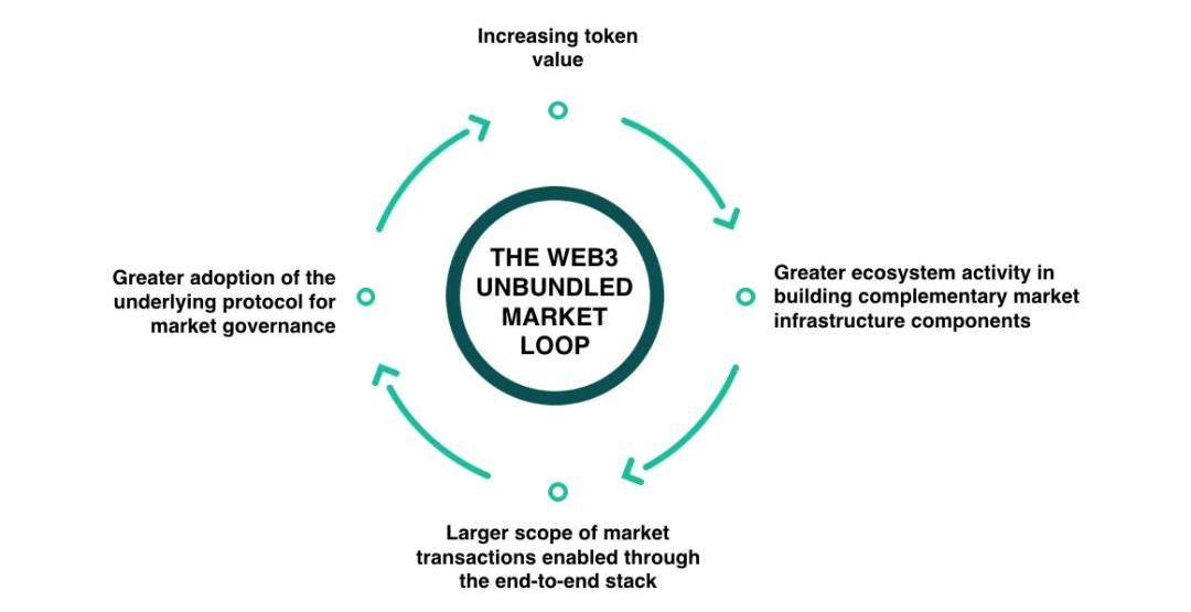 Web3網絡的另一個不同是組成部分。Web2網絡主要包括參與價值創造和交換的市場參與者:即生產者和消費者。雖然開發人員可以進一步擴展Web2平臺,但核心市場基礎設施由平臺所有者提供。Web3中的生態參與者還包括那些為市場建設基礎設施以實現某種功能的個體貢獻者。Web3中,基礎設施資源可能由生態參與者提交,而不是集中設置。開發人員圍繞協議構建基礎設施,提供使生產者和消費者能參與市場的功能。如Unbundlingtheunbundlers中所述:在Web2世界中,市場基礎設施和市場治理被平臺捆綁在一起。亞馬遜、Ebay、Upwork、優步和其他此類市場將市場基礎設施和市場治理捆綁在一起。在Web3世界中,市場基礎設施與市場治理分離。雖然市場治理的核心組件被編碼到協議層,但市場基礎設施的組件可以由圍繞協議的生態構建。由于市場基礎設施需要在外部進行建設,因此市場基礎設施的建設需要與市場活動的擴大同步進行管理。在Web2平臺上,平臺管理者需要管理供需之間的可對應。例如,如果早期Airbnb上的所有房源都在丹佛,但用戶正在搜索紐約市的房源,交易則不能進行。但在Web3上需要在市場基礎設施和對應的市場活動之間進行額外的協調和激勵。例如,如果web3平臺上的用戶尋求某特定類型的搜索界面,則平臺需要通過提供獎勵來吸引開發人員參與建設該項目,從而能滿足這些需求。總之,管理Web3網絡效應不單需要管理市場活動,還需要管理其與市場基礎設施的協調。當Web3生態系統達到這種平衡時,它們將處于一個正反饋循環,且該循環能進一步放大這些生態: