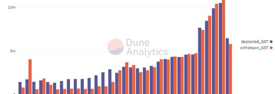 圖3-2Stepn總活躍用戶數下圖是SOL、GST每日的提現與存入情況,可以看出,每日產出的GST在除去游戲內復投以外的拋壓與新用戶進場的速率較為吻合,并沒有明顯的用戶進場速率過快,導致存入的GST增加與用戶進場過慢,導致產出的GST買盤不足的情況,同時在觀察了近期的USDC的出入金情況后,發現Stepn用戶近期的USDC的出入金數量也維持在一個平衡的狀態。
