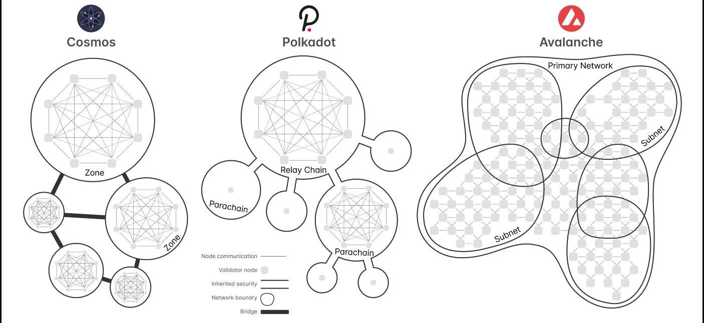 來源:Etherscan,AvalancheNetwork,Snowtrace子網-水平擴展Avalanche利用這一強勁勢頭在最近宣布了AvalancheMultiverse,這是一項價值2.9億美元的激勵計劃,旨在加速子網的應用推廣。子網是Avalanche的核心擴展技術,允許開發人員構建獨立于現有Avalanche鏈的特定應用網絡。子網可以有不同的執行環境、Gas代幣、以及控制驗證者數量等,從而使開發人員對其應用程序擁有更大的控制權。最重要的是,子網允許并行處理數百個交易,從而使Avalanche實現水平擴展。子網在概念上類似于Cosmos的Zone和Polkadot平行鏈。Cosmos、Polkadot和Avalanche的拓撲模型