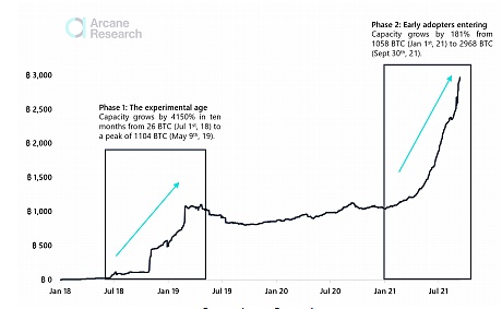 圖3 - 閃電網絡:2018-2021年公共BTC容量??