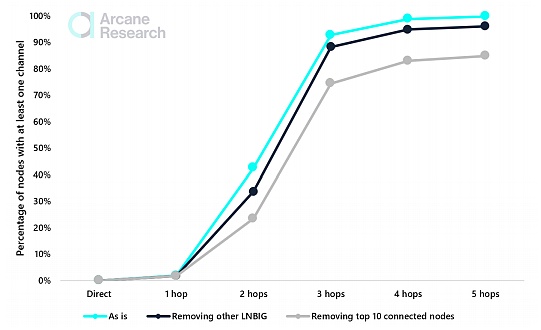 為了測試路由集線器的現狀重要性,我們首先移除其他LNBIG節點集線器,并移除其他十個連接最緊密的節點。結果如下圖所示。當我們移除一些大型路由集線器時,John在幾次跳躍中到達多個節點以及最終到達所有節點的能力顯著降低。