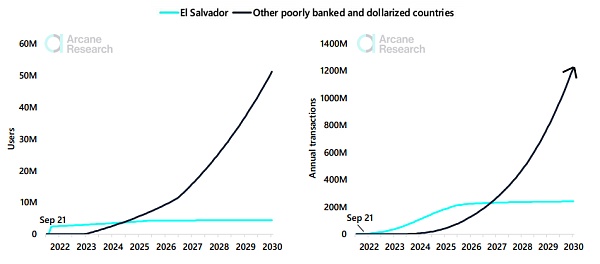 如果成功,其他國家將嘗試效仿薩爾瓦多的做法。第一個緊隨其后的國家可能是其他銀行準入條件差、本幣升值或被取消的國家。我們在高度依賴匯款和嚴重依賴美元的銀行狀況不佳的國家中,列出了潛在追隨者的“熱門名單”。這些國家總共有8.5億人口,其中650人目前沒有銀行賬戶。如果在2030年之前,有10%的國家使用比特幣,那么到2020年代末,閃電用戶將增加5000萬。到2030年,這些用戶的閃電支付年交易額將超過170億美元,通過家庭支出和匯款支付的閃電交易將超過12億美元。這些數字將在21世紀30年代增加,僅通過增加使用,更不用說更多的國家也會趕上來。