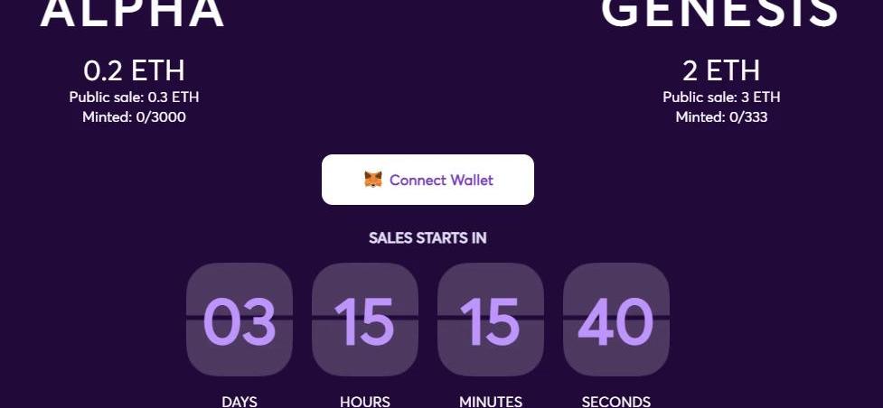 購買其推出的Alpha和GenesisNFT,以解鎖在平臺的權限。2天后將開啟公售,售完即止。需在其官網連接metamask錢包,mint不同屬性與價格的Alpha與GenesisNFT。兩者具體權益見下文分析,總體價格與權益成正比,GenesisNFT的權益較AlphaNFT更為豐富。