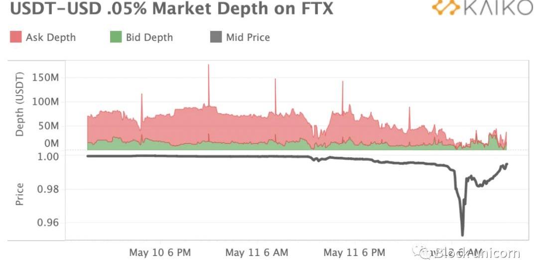 除Bitfinex外,其他大多數交易所的市場深度均有所下降,Bitfinex試圖捍衛USDT的價格穩定與出價通過查看交易所的數據交易,我們可以清楚地看到今天凌晨為捍衛USDT的錨定所做的努力。毫不奇怪,與Tether屬于同一母公司的Bitfinex通過提高投標深度來捍衛與USDT掛鉤的最大努力。這就是為什么在我們的第一個USDT價格圖表中,我們看到Tether在Bitfinex上的價格沒有變動。另一方面,我們可以觀察到其他交易USDT/USD的最大交易所的流動性急劇下降,這可能導致脫鉤。放大FTX上0.05%的平均市場深度,我們可以觀察到在取消掛鉤后買賣深度有所下降,盡管此后買賣深度已經恢復。