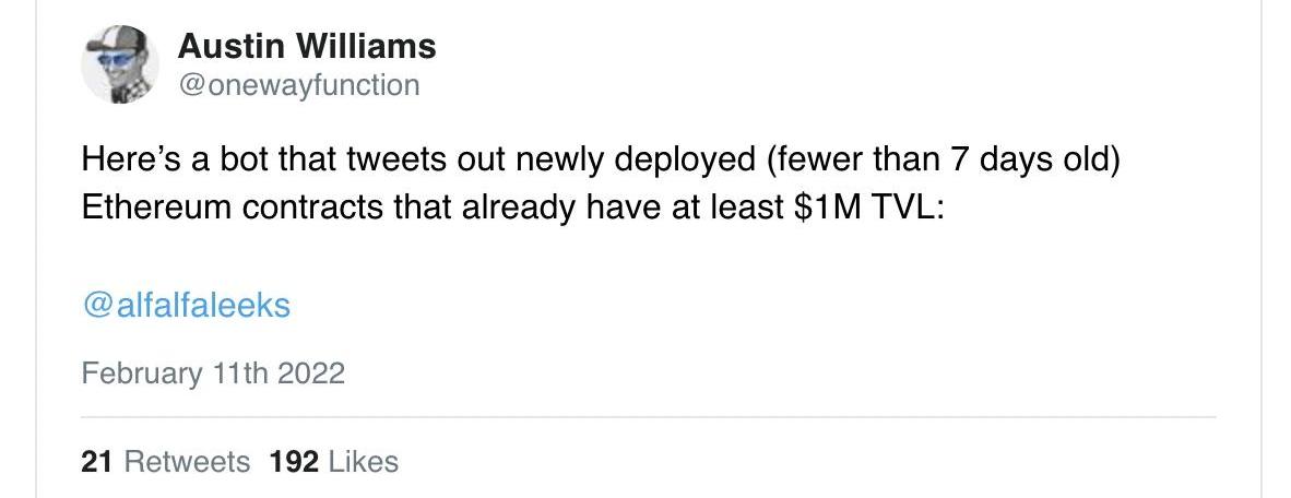 這是一個機器人,它會發布新部署的以太坊合約,這些合約已經擁有至少100萬美元的TVL:@alfalfaleeks想要真正認真地盡早尋找新的NFT項目嗎?考慮讓機器人進行狩獵。例如,安全研究員AustinWilliams創建了AlphaLeaksBot,當新的以太坊智能合約的總鎖定價值(TVL)首次超過100萬美元時,它會發出推文。如今,機器人推文中提到的許多項目都是新貴的NFT集合。誠然,這些項目中的大多數都是垃圾,永遠不會有任何意義,但你不能排除這個機器人會在未來盡早讓你成為NFT明星。至少,這類自動化服務值得關注。4.查找NFT空投日歷