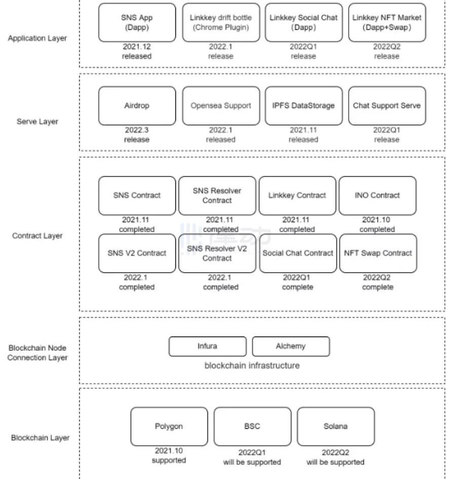 Linkkey是一個Web3開源社交協議,用戶可以在這里運營自己的個人NFT和社區NFT。它基于SNS底層域名協議,這是ENS上的一個分叉,集成了了跨鏈、多鏈注冊,以及NFT社交等應用場景,并且不會收取年費。同時LinkKey也是一個DAO組織,沒有任何贊助方或投資者,以KEY為治理Token。Linkkey將首先部署在Polygon鏈上,并在未來兼容BSC、Solana等更多生態。目前,SNS域名合約仍然基于以太坊ERC-721標準構建,KEYToken則采用ERC-20標準。此外,Linkkey生態系統中的數據會使用IPFS協議進行永久存儲。