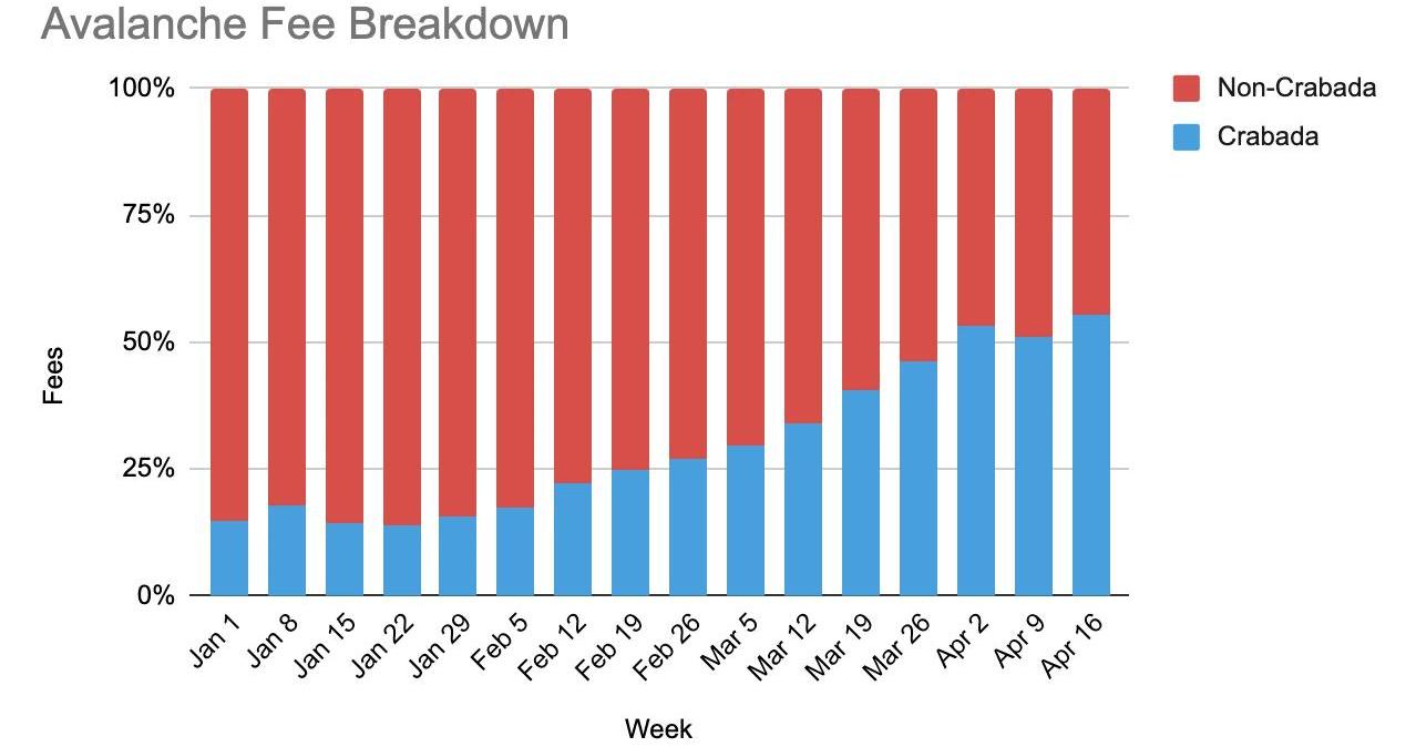4/是什么推動了這種需求?Crabada是Avalanche上一款「邊玩邊賺」游戲,于2021年11月推出。在過去的一年里,它消耗的網絡區塊空間穩步增長。如今,這款游戲的主合約消耗了整個網絡超過50%的交易費用。