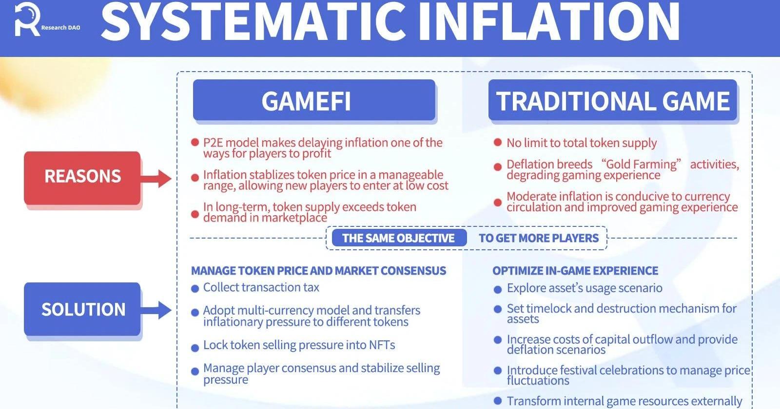 市場的存在是區塊鏈技術固有的:玩家需要代幣流動性才能找到反映在市場價格中的項目價值。目前,幾乎所有GameFi項目都在區塊鏈上發行加密貨幣并在二級市場上流通。一些GameFi項目會發行兩三種加密貨幣來完成復雜經濟模型的構建。例如,AxieInfinity具有由雙幣加上AxieNFT組成的三代幣機制。Tokenomics:為什么通貨膨脹被延遲,但無法解決GameFi開發團隊會通過游戲機制的設計和普通玩家共識的管理,為自己謀求最大的利潤。在GameFi,團隊不僅承擔著游戲運營的任務,也是整個游戲生態復雜共識游戲的主要參與者之一。因此,GameFi中的代幣機制自然會產生通貨膨脹,并將通貨膨脹的后果通過生態系統傳遞給玩家。我們以AxieInfinity為例,其治理代幣AXS具有長期通縮模型。其特殊的兩種代幣機制以及NFTs的使用,使得SLP承擔了三種資產的全部拋售壓力。另一方面,官方也支持通貨膨脹現象的出現:適度的通脹使AXS的價格保持穩定,這將降低新玩家的進入門檻,擴大進入量。在AxieInfinity中,團隊持有大量AXS,而打金公會YGG持有大量AxieNFT。廣大玩家和打金用戶持有大量SLP,即游戲日常活動中使用的消費代幣。由于產生的SLP比消耗的多,SLP注定會流入價格下跌的“死亡螺旋”。與此同時,AXS和AxieNFT的價格可能會繼續上漲。這增加了進入壁壘,降低了打金用戶的收入。因此,下跌的SLP價格將促使他們離開市場。從長遠來看,通脹趨勢將對Axie團隊的收益產生負面影響。團隊對三種代幣機制之間的兌換比例以及二級市場的做市進行了一系列調整。這些變化導致SLP價格暫時上漲,從而延遲了玩家的流失。雖然通脹不會得到解決,但AxieInfinity展示了減緩GameFi項目通脹的具體想法:從其經濟模型設置來看:多幣種&NFT模型不斷將單一幣種的通脹及拋售壓力轉移到其他相關幣種,給游戲開發團隊更多的監管和調控空間。從長遠來看,這項規定會延遲損失并設法留住用戶。從其供需設置來看:增加SLP消耗——>調整AxieNFT育種公式——>SLP成本增加3倍——>AXS成本降低至0.5?增加SLP使用場景。減少SLP釋放量—>取消玩家等級800后的每日獎勵SLP—>玩家不再從冒險模式獲得SLP—>SLP輸出模式變為PvP模式?逐步減少甚至取消每日任務和獎勵PvE模式。3.2GameFi抑制通脹的方法