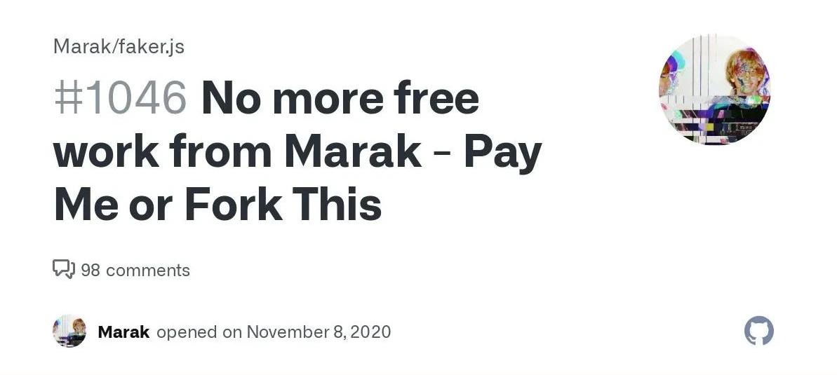 開源供應鏈投的例子在最近也屢見不鮮,比如主動投(盡管本意可能是好的)的Faker.js和node-ipc,還有不小心危害了整個互聯網安全的Log4j(最近Java好像又出事了).