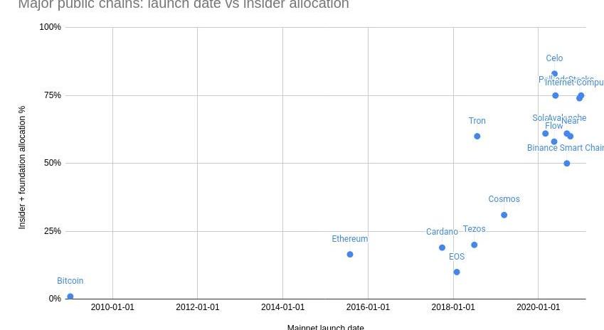 許多行業和領域都遵循一個相似的模式。首先,某種新的令人興奮的技術被發明出來,或取得很大的飛躍性改進到一定程度,它實際上可以用于某些方面。在開始的時候,該技術仍然是笨重的,讓幾乎每個人都把它作為投資來碰的話風險太大了,且沒有人們使用它來變得成功的“社會證明”。因此,最先參與的人將是理想主義者、技術極客和其他真的為這項技術以及它對改善社會的潛力感到興奮的人。然而,一旦這項技術充分證明了自己,普通人就會進來——在互聯網文化中,這種事件經常被稱為“永恒九月(EternalSeptember)”。這些還不是一般善意的普通人,只想感受令人興奮的部分,而是穿西裝的商業普通人,他們開始狼眼般地搜索生態系統,尋找賺錢的方法——風險投資者大軍同樣渴望從旁支持他們賺取自己的錢。在極端情況下,徹頭徹尾的騙子進場,創造出沒有任何社會層面或技術層面可取價值的區塊鏈,基本接近于騙局。這樣,生態系統發展時間越長,在光譜上處于利他主義一邊的任何新項目就越難開展。區塊鏈行業用短期逐利的價值觀慢慢取代哲學和理想主義價值觀的一個嘈雜指標是越來越大的預挖(premine)比例:加密貨幣的開發者分給自己的份額。