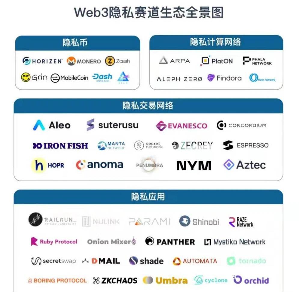 隱私始終是保護用戶權利和擴大加密市場的基礎,是Web3的重要方向之一。在開放及用戶主導的Web3時代,隱私保護將會是一種標配。從我們日常生活來說,我們都經歷過保護秘密的小心翼翼,如一本記載心情的日記本、一個不透露身份分享秘密的樹洞,它們代表著我們的主動保護隱私的訴求。隨著交互活動需求的增加,我們需要被動的提供自己的一些關鍵信息,脫離自己可控范圍的外部保障,對隱私信息不被傳播作惡就顯得尤為重要。但很多的現實情況是,隨著越來越多解析工具的出現,以及中心化平臺對用戶信息的把控,隱私信息泄漏問題變得越來越嚴重,就像Facebook這樣的互聯網巨頭也在隱私泄漏問題上屢被點名。Web3主張捍衛用戶權利,從中心化的模式中放權于普通大眾,打造去中心化的價值互聯網。那么在這樣的需求背景下,隱私數據泄露、個人信息被販賣的問題就要加緊解決,真正扭轉用戶在Web2中的負面現狀。Web3時代的隱私既要保密又要匿名,在實際的操作中,包括數據隱私、身份隱私、計算隱私,這是一個非常宏大的課題,在過往的發展中數據隱私和身份隱私的解決方案相對來說逐漸成熟,基本能保證數據內容的隱私交易,以及物理身份和數字身份的隔斷。而在計算隱私方面,它的科技水準要求更高,發展的進程也相對緩慢。這一賽道也是行業抱有探索和深挖態度的角逐地帶。隱私計算類型