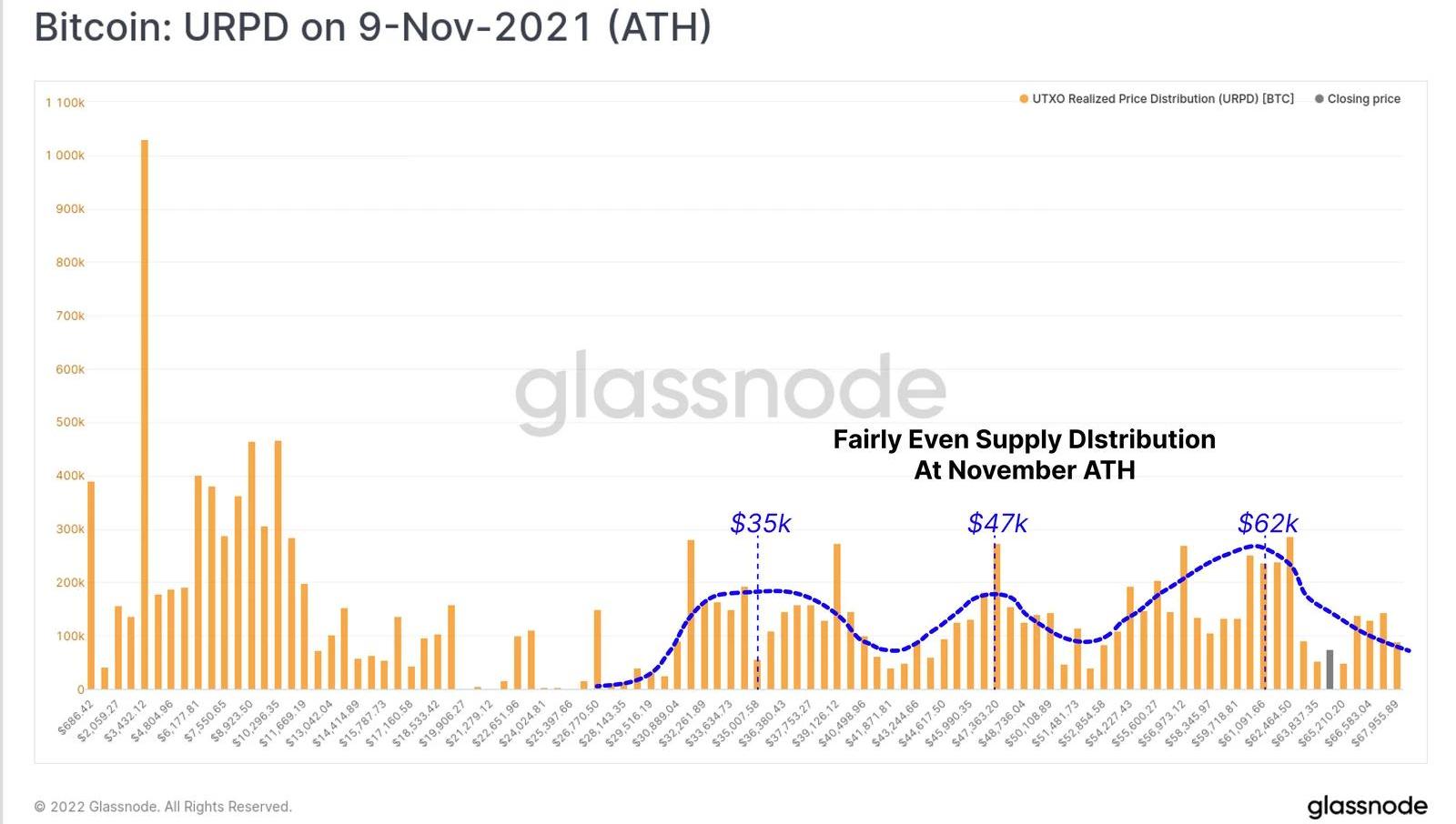 實時圖表在當前的市場修正中,我們可以看到,在2021年7月至11月ATH的反彈期間,代幣供應的分布非常均勻,該分布表明:許多在5-7月調整中進行積累的投資者在回升途中獲利。這創造了3.5萬美元、4.7萬美元和6.2萬美元左右的成交量節點。買家在整個8月至11月的反彈中看到了價值并進入市場。盡管鏈上的活動表明大多數“市場游客”已經離開,只有HODLers留下來。