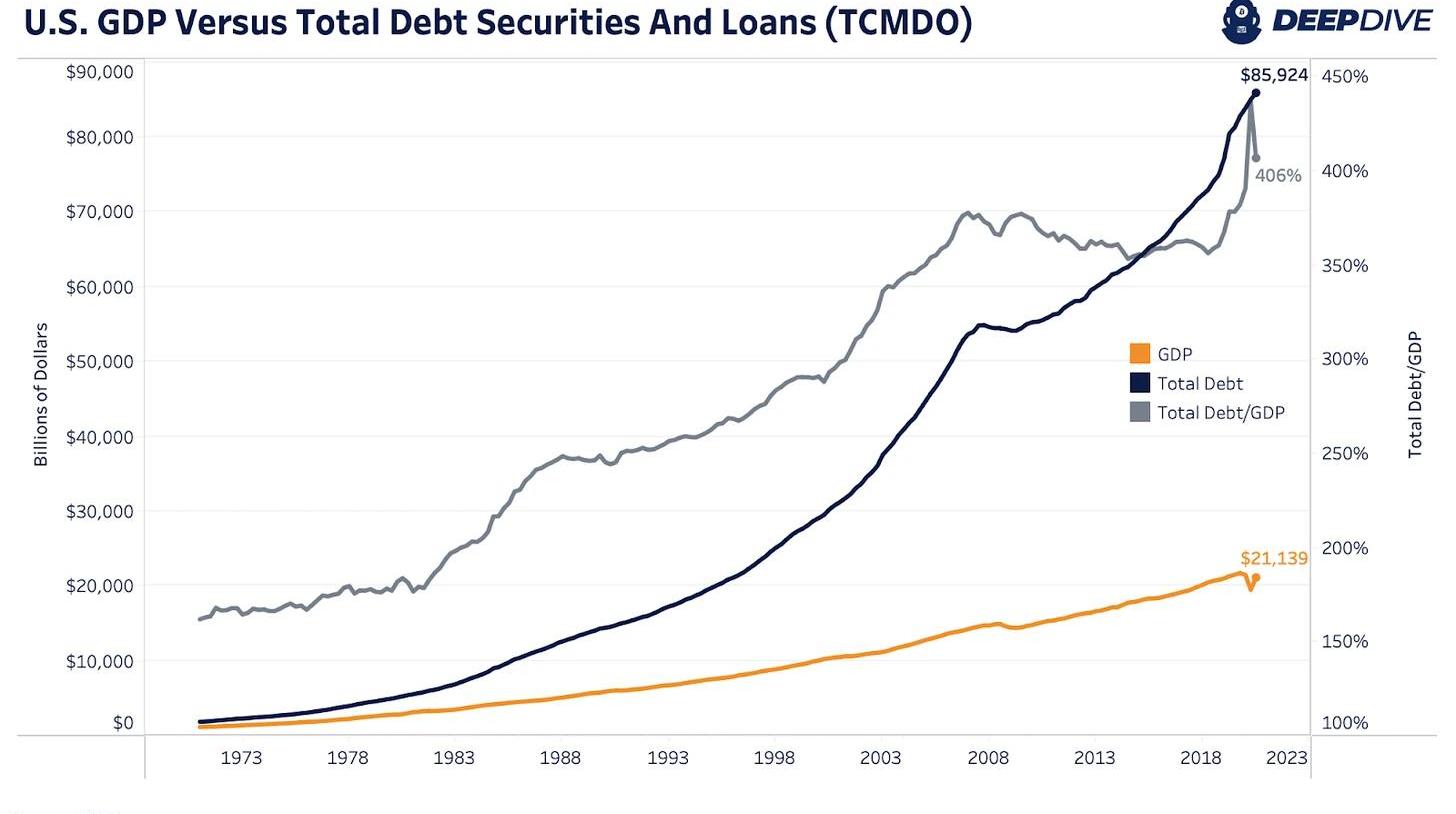 為什么Bitcoin這類貨幣資產,會出現這樣的市場反應呢?這是因為法定貨幣體系其實建立在其背后內含的美元空頭交易之上。得益于信貸期延長政策,市場中的美元才得以流通。因此,在市場流動性下降或減速時期,多種資產也將同步拋售。目前看來,我們正處于股票和債券市場波動加劇的范式當中。Bitcoin將用其歷來的做法來進行應對:在可信地執行一個完全固定的終端供應上限的同時,給予其使用者以數字財產權,并由Crypto算法而非官僚機構加以執行。美國債務與GDP的總比率約為400%,這也就意味著,每100美元產出的背后都有著400美元的帶息債務。